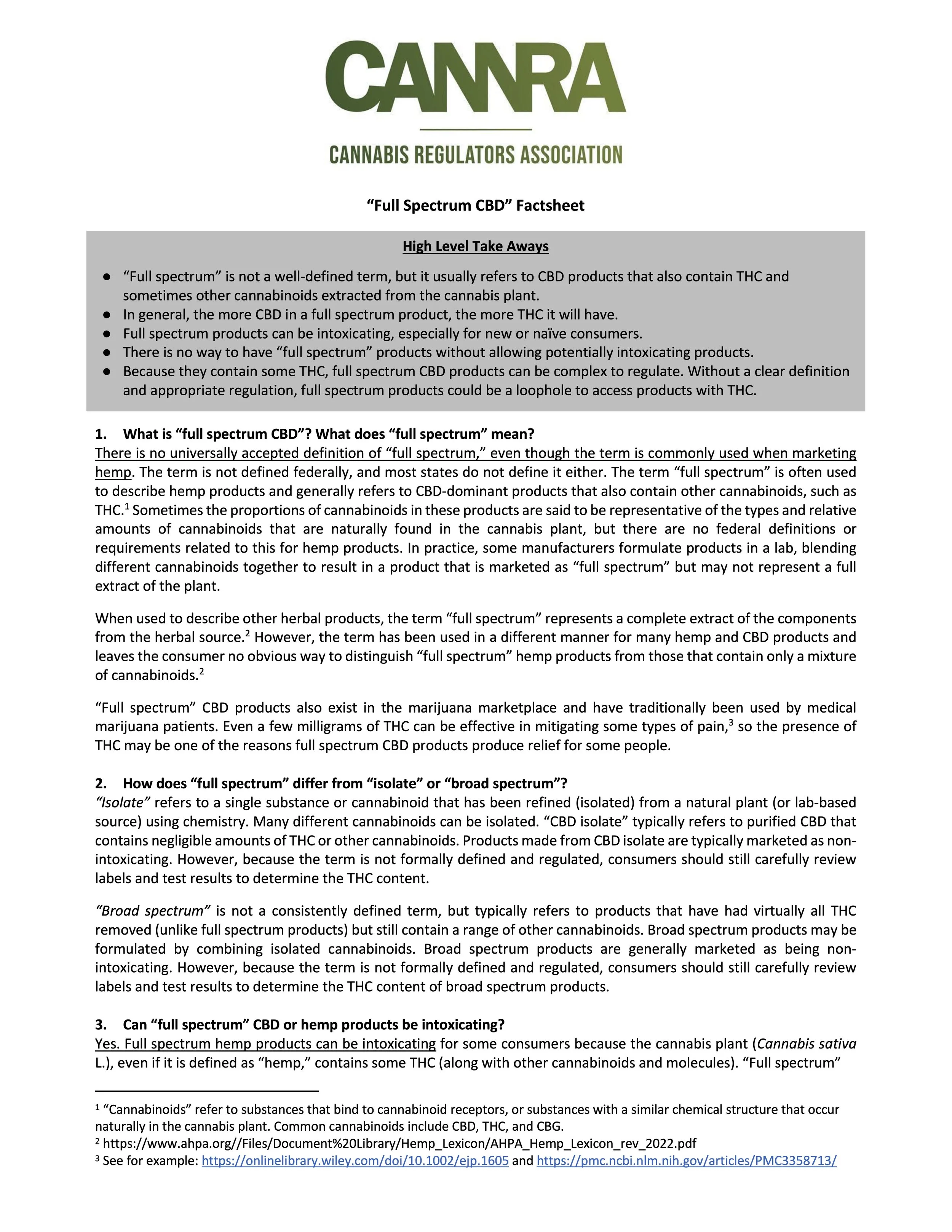 This factsheet provides details about how “full spectrum” is not a well-defined term when used to describe CBD and hemp products. It also describes some of the complexity and considerations related to “full spectrum” CBD product regulation. This factsheet is provided for educational purposes only and is not intended to represent a policy position from CANNRA or any of our member jurisdictions. The full factsheet is available here.